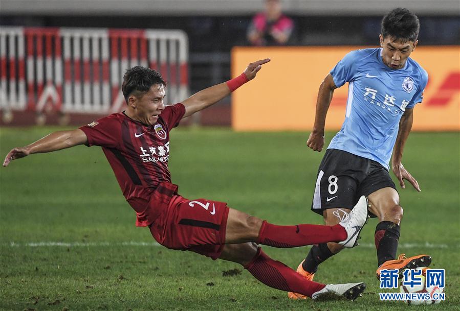 ↑8月5日,大连一方队球员朱挺(右)与上海上港队球员张卫在比赛中拼抢。当日,在2018赛季中超联赛第16轮比赛中,大连一方队主场对阵上海上港队。新华社记者潘昱龙摄