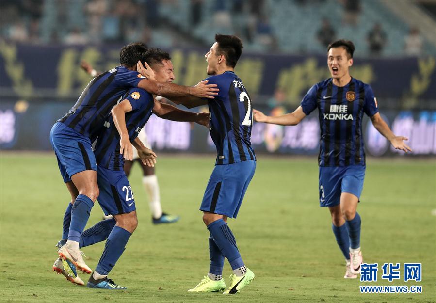↑8月5日,江苏苏宁易购队球员吴曦(左二)与队友庆祝进球。当日,在2018赛季中超联赛第16轮比赛中,江苏苏宁易购队主场以3比1战胜贵州恒丰队。新华社记者杨磊摄