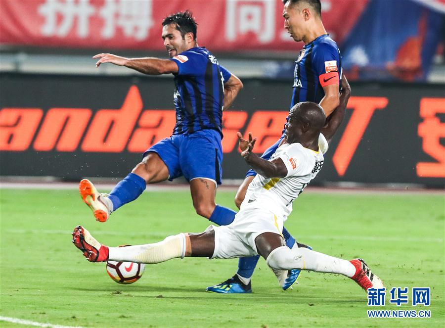 ↑ 8月5日,贵州恒丰队球员法图斯(下)在防守江苏苏宁易购队球员埃德尔(左)的进攻。新华社记者杨磊摄