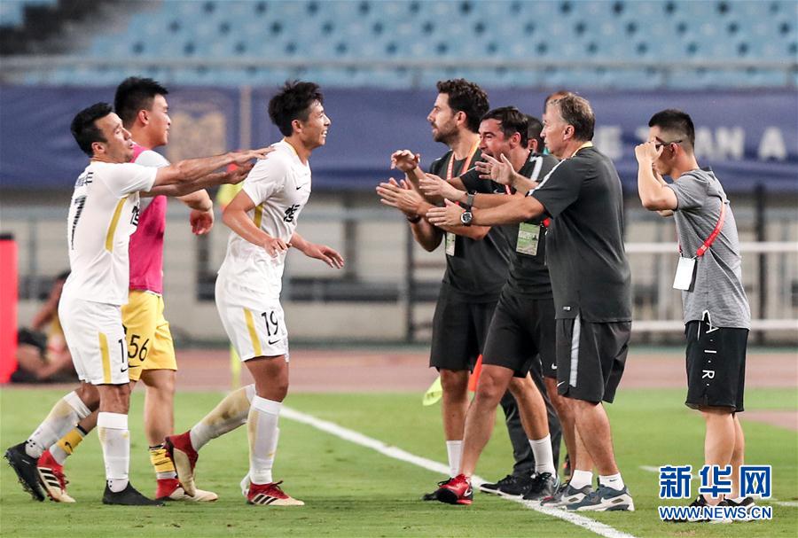 ↑8月5日,贵州恒丰队球员郑凯木(左三)与队友庆祝进球。新华社记者杨磊摄