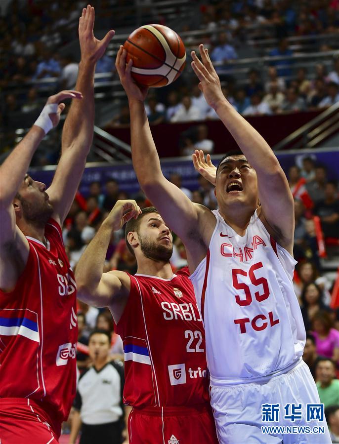 ↑8月5日,中国男篮蓝队球员韩德君(右)在比赛中进攻。当日,2018年梅河口国际男篮锦标赛在吉林省梅河口市进行,中国男篮蓝队以79比70战胜塞尔维亚队,以三战全胜的成绩夺得本次锦标赛冠军。新华社记者林宏摄