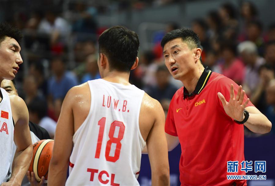 ↑8月5日,中国男篮蓝队主教练杜锋(右)在给队员布置战术。新华社记者林宏摄