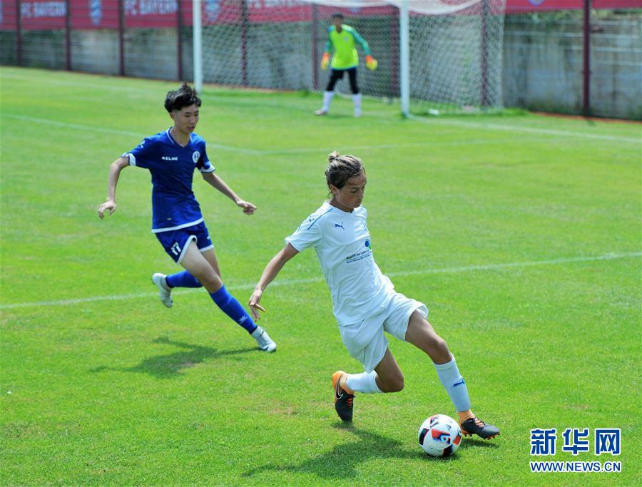 ↑8月5日,德国瓦尔多夫足球队球员劳林(右)与中国青岛一中队球员连新宇在揭幕战比赛中角逐。新华社发(俞方平摄)