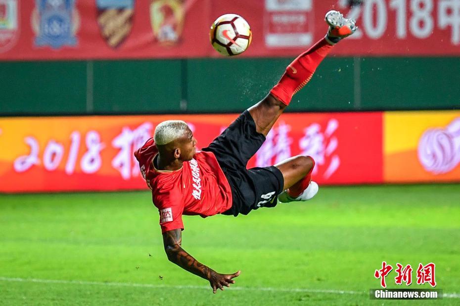 广州恒大淘宝球员塔利斯卡在比赛中倒钩射门。中新社记者 陈骥旻 摄