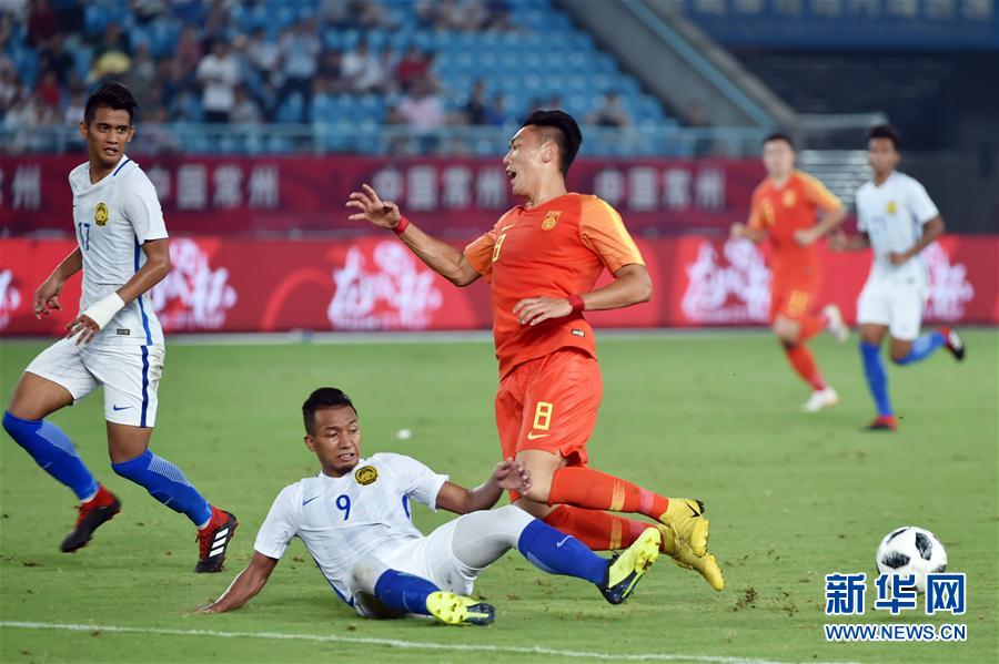 ↑8月5日,中国队球员冯伯元(前右)与马来西亚队球员阿兹林在比赛中拼抢。 当日,在江苏常州举行的2018中国足协中国之队国际足球赛中,中国U23男子足球队以2比1战胜马来西亚U23男子足球队。 新华社发(陈暐摄)