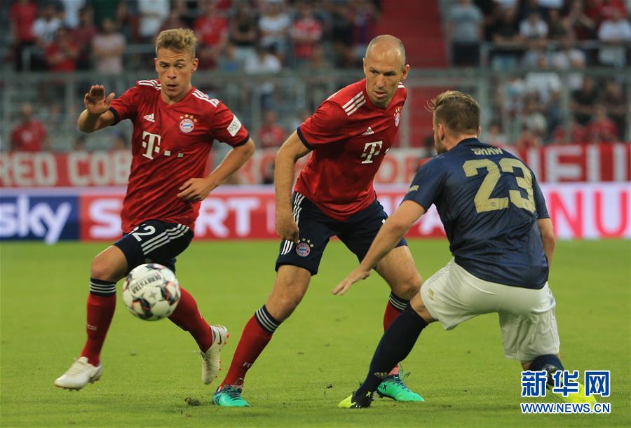 ↑8月5日,拜仁慕尼黑队球员罗本(中)与曼彻斯特联队球员卢克·肖(右)在比赛中拼抢。 新华社发(菲利普·鲁伊兹摄)