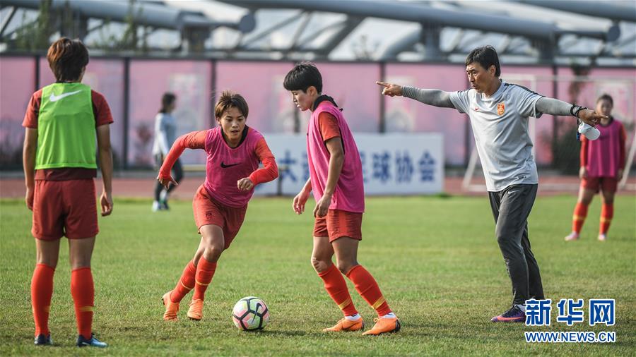8月6日,中国女足主教练贾秀全(前右一)在训练中。新华社记者潘昱龙摄