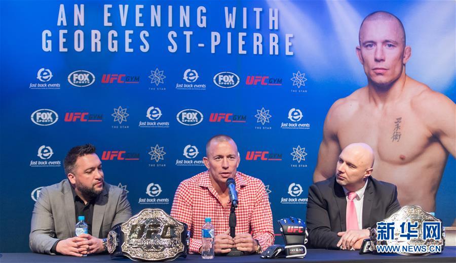 8月6日,乔治·圣皮埃尔(中)在记者会上。 当日,世界顶级综合格斗冠军赛UFC明星乔治·圣皮埃尔在悉尼举行新闻发布会,他将会在悉尼、墨尔本和布里斯班举行三场演讲。 新华社发(朱宏业摄)