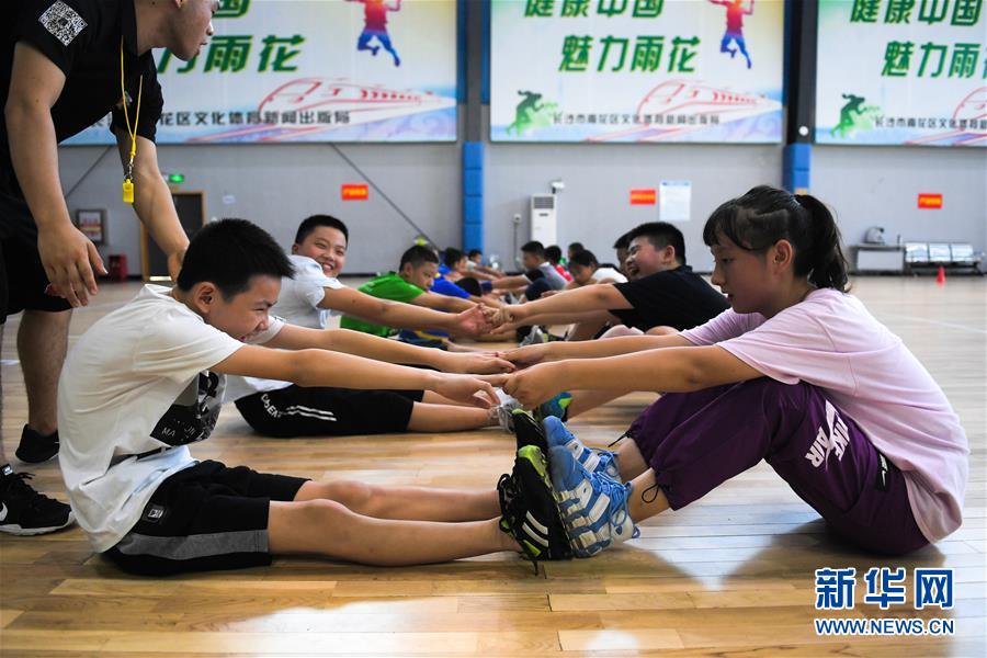 8月6日,少年儿童在训练中热身。 新华社发(陈泽国摄)