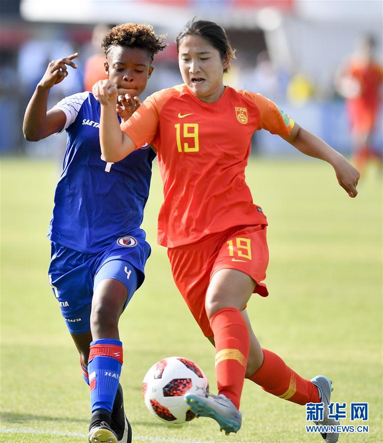 ↑8月6日,中国队球员陈圆梦(右)与海地队球员夏尔在比赛中拼抢。 当日,在法国举行的国际足联U20女足世界杯D组小组赛中,中国队以2比1战胜海地队。 新华社记者陈益宸摄