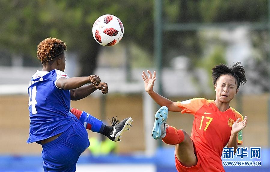 ↑8月6日,中国队球员张琳艳(右)与海地队球员埃米琳·查尔斯在比赛中拼抢。 当日,在法国举行的国际足联U20女足世界杯D组小组赛中,中国队以2比1战胜海地队。 新华社记者陈益宸摄