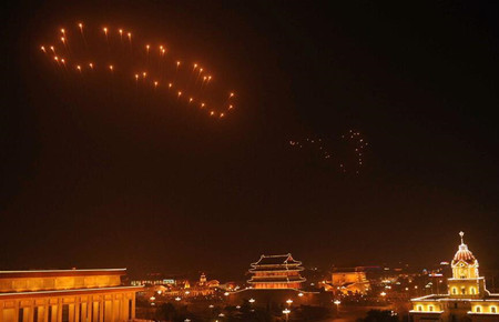 这是2008年8月8日拍摄的天安门广场上空燃放的北京奥运会开幕式焰火《历史足迹》上的“脚印”。