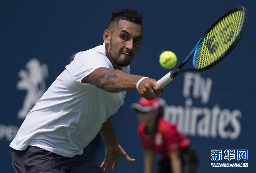 ↑8月7日,尼克·克耶高斯在比赛中回球。 当日,在加拿大多伦多举行的2018年罗杰斯杯网球赛男单首轮比赛中,瑞士选手瓦林卡以2比1战胜澳大利亚选手尼克·克耶高斯,晋级第二轮。 新华社发(邹峥摄)