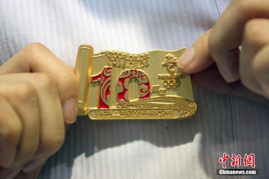 8月8日,北京奥运会10周年纪念日。北京冬奥组委特别推出的9款纪念北京2008年奥运会成功举办10周年限量版特许商品上市首发。本次销售的纪念版特许商品共9款,包括:2枚徽章、1枚纯银纪念章、1枚铜镀金纪念章、1套笔记本套装、1枚纪念封、2本邮册和1套邮折。徽章-“10周年纪念”限量发售1000枚,从夏季水上运动到冬季冰雪运动,寓意以北京2022年冬奥会筹办为契机,冰雪运动正逐步成为大众体育新风尚;徽章-“双奥之城”限量发售5000枚,造型源自记载历史的简牍,选取08年最具代表性的祥云纹做装饰,突出体现双奥之城-北京的10年奥运情结;纯银纪念章和铜镀金纪念章各限量发售2022枚,铜镀金纪念章规格为直径40毫米;银章直径35毫米,由999足银制作,重15克。两枚徽章均采用独特造币彩印工艺精细呈现了两届奥运会开幕式场馆鸟巢的倩影;笔记本套装限量发售3000套,以2008年北京奥运会开幕式点燃的火炬呼应平昌冬奥会北京八分钟的冰屏,充分展现北京传统与现代兼容的城市个性;北京奥运会10周年主题纪念封1枚,发行量20000个;为纪念北京成为历史上第一个既举办过夏奥会又将举办冬奥运的城市,经国际奥委会和北京冬奥组委批准,中国邮政集团会同萨马兰奇基金会发行了2本纪念邮册,分别名为“中国荣耀”、“精彩北京—北京奥运10周年”和1套纪念邮折-“世界,因梦想而伟大”,其中包含了北京2008年奥运会和北京2022年冬奥会的纪念邮票,具有非常特别的纪念价值,供广大消费者和集邮爱好者收藏。该款商品很快就被抢购一空。 中新社记者 任海霞 摄