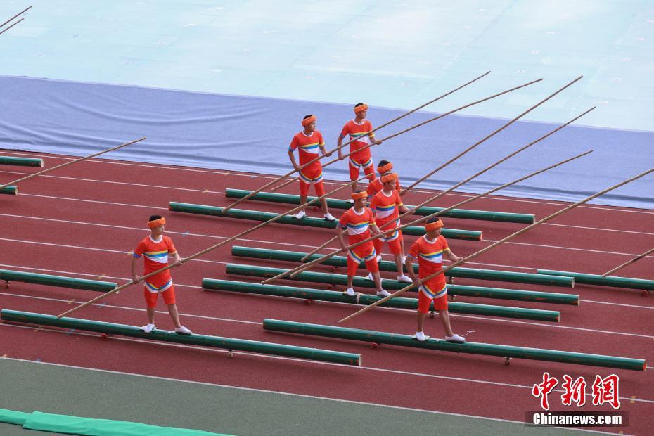 8月8日,贵州省第十届运动会在贵州省遵义市奥体中心体育场开幕。据悉,贵州省第十届运动会,竞技体育组设置20个大项377个小项,群众体育组设置31个大项168个小项,是贵州历届省运会规格最高、规模最大的一届综合性体育盛会。图为开幕式文艺展演节目中的电子独竹漂表演。 中新社记者 瞿宏伦 摄