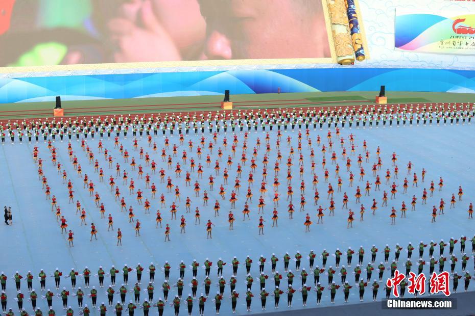 8月8日,贵州省第十届运动会在贵州省遵义市奥体中心体育场开幕。据悉,贵州省第十届运动会,竞技体育组设置20个大项377个小项,群众体育组设置31个大项168个小项,是贵州历届省运会规格最高、规模最大的一届综合性体育盛会。图为开幕式文艺展演节目中千人同跳广场舞。 中新社记者 瞿宏伦 摄