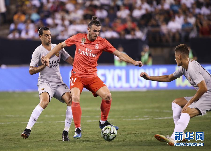 ↑8月7日,皇家马德里队球员贝尔(中)在比赛中带球突破。新华社记者王迎摄