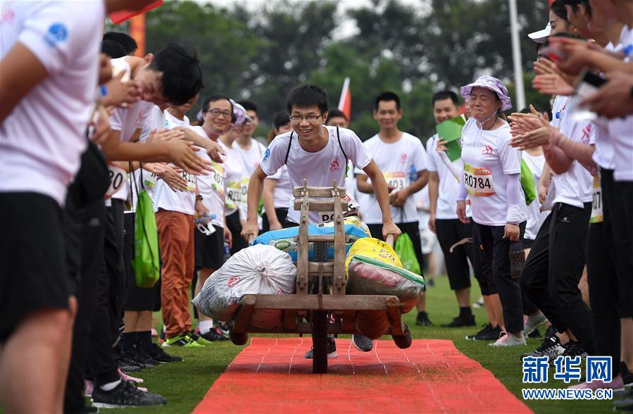 ↑8月8日,体验者参加“手推独轮车”农耕健身项目。 当日,2018年“全民健身日”江西省农耕健身特色示范活动在江西省南昌县举行,近3000名群众参与了手推独轮车、举石矶、抛秧苗、挤棍等多项农耕健身项目。 新华社记者万象摄