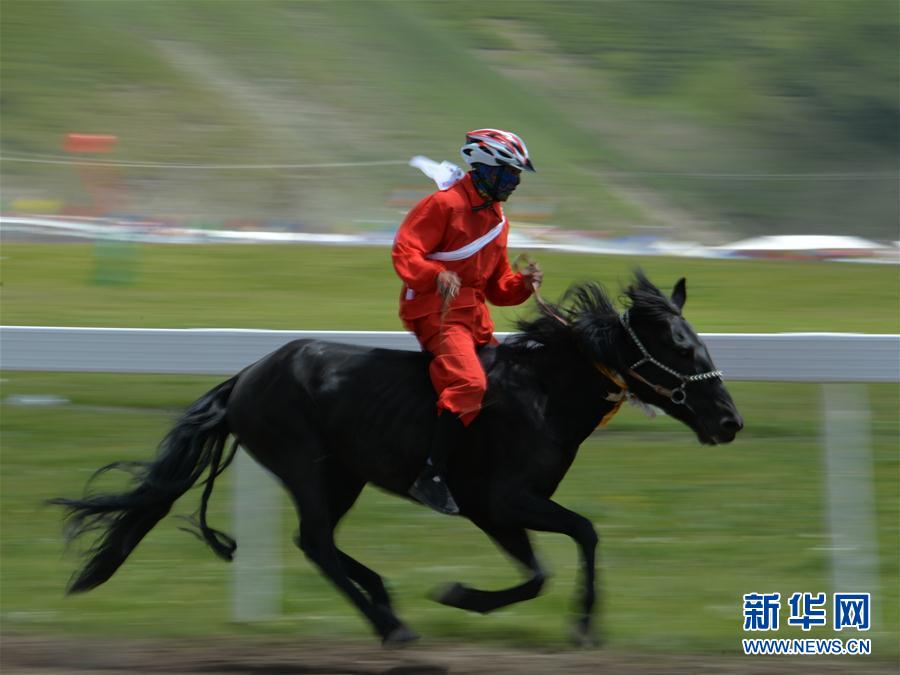 ↑8月8日,参赛选手在比赛中。 当日,我国迎来第十个全民健身日。青海省首届“民族团结进步杯”少数民族传统赛马邀请赛在青海省果洛藏族自治州达日县岭国赛马滩举行。 新华社发(张龙摄)