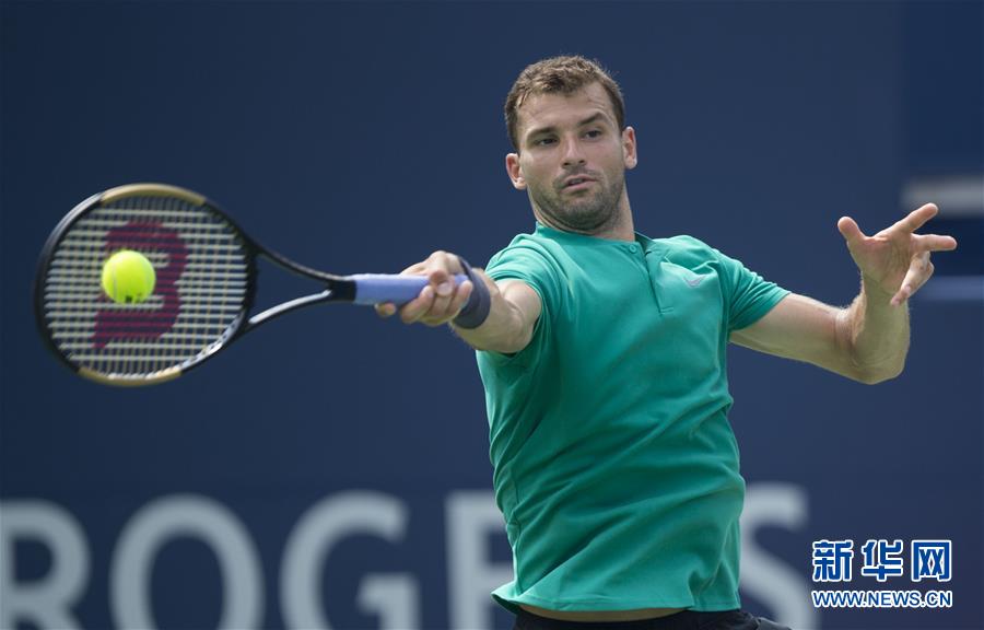 8月9日,季米特洛夫在比赛中回球。 当日,在加拿大多伦多举行的罗杰斯杯网球赛男单第三轮比赛中,保加利亚选手季米特洛夫以2比1战胜美国选手蒂亚弗,晋级八强。 新华社发(邹峥摄)