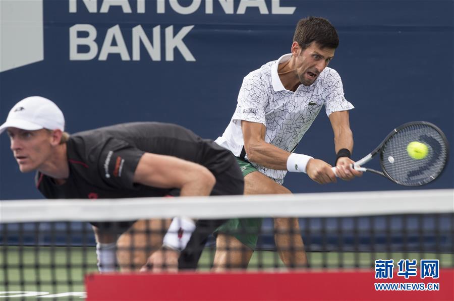 8月9日,焦科维奇(右)/安德森在比赛中。 当日,在加拿大多伦多举行的罗杰斯杯网球赛男双第二轮比赛中,焦科维奇(塞尔维亚)/凯文·安德森(南非)以2比1战胜法国组合赫伯特/马胡特,晋级八强。 新华社发(邹峥摄)