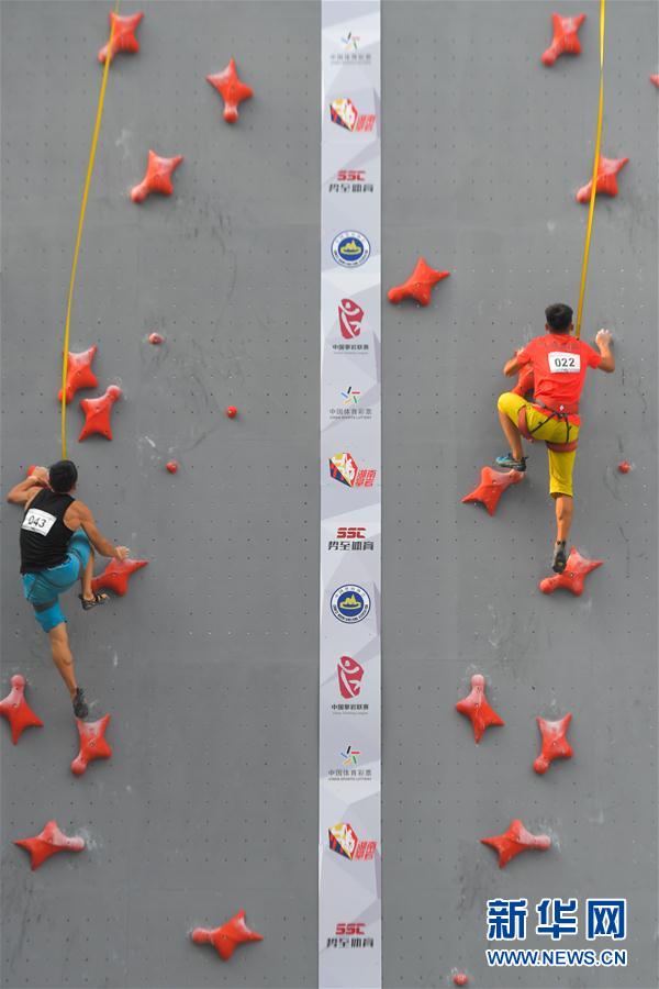↑8月10日,福建铁观音攀岩国训队选手黄鑫(左)与山东鲁普耐特攀岩国训队选手高杰在男子速度赛预赛中。新华社发(陈泽国摄)