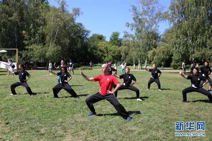 8月11日,武术爱好者在展示太极拳。 当日,在罗马尼亚首都布加勒斯特国王米哈伊一世公园内,武术爱好者聚集在一起庆祝首个“世界武术日”。 新华社记者陈进摄