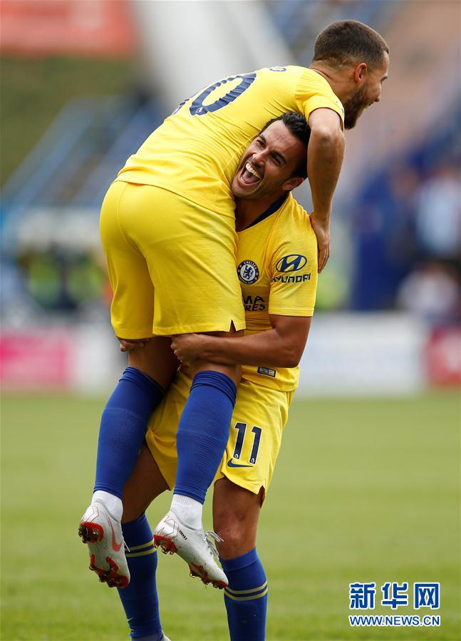 8月11日,切尔西队球员佩德罗(下)进球后举起为他助攻的队友阿扎尔庆祝。 当日,在2018/2019赛季英超联赛首轮比赛中,切尔西队客场以3比0战胜哈德斯菲尔德队。 新华社/路透