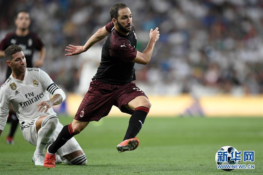 8月11日,AC米兰队球员伊瓜因(右)带球突破皇家马德里队球员拉莫斯的防守。新华社/法新