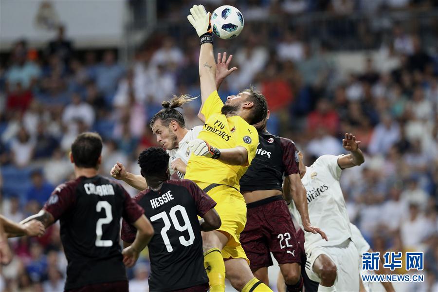 8月11日,AC米兰队守门员唐纳鲁马(中)在比赛中扑救。 新华社/美联