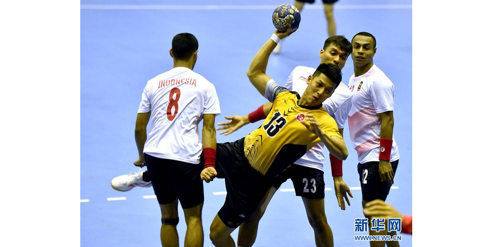 ↑8月13日,中国香港队球员叶仕仁(左二)在比赛中射门。 当日,在雅加达举行的第18届亚运会男子手球小组赛中,中国香港队以40比17战胜印度尼西亚队。 新华社记者岳月伟摄