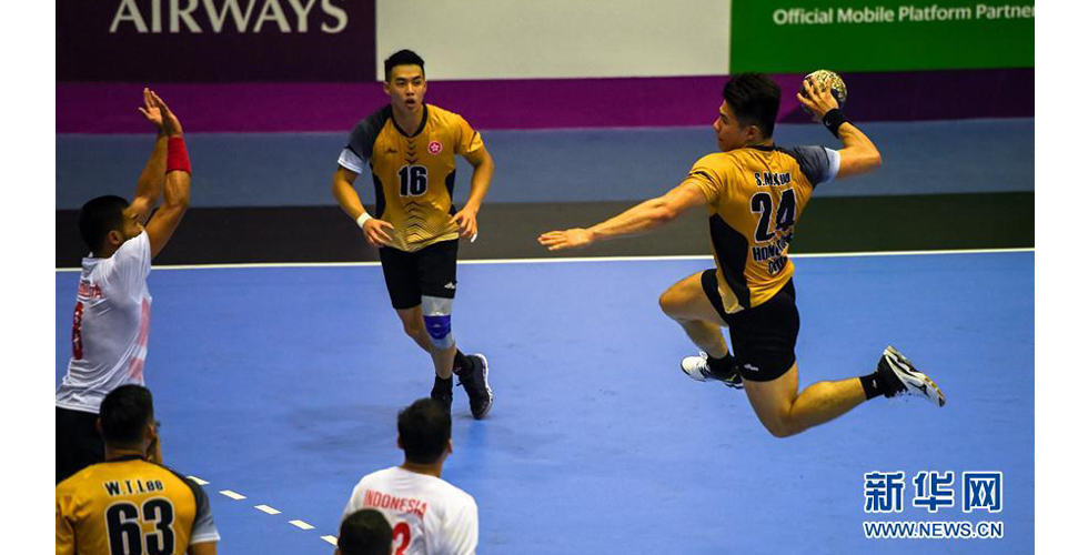 ↑8月13日,中国香港队球员郭斯鸣(右一)在比赛中进攻。 当日,在雅加达举行的第18届亚运会男子手球小组赛中,中国香港队以40比17战胜印度尼西亚队。 新华社记者李响摄