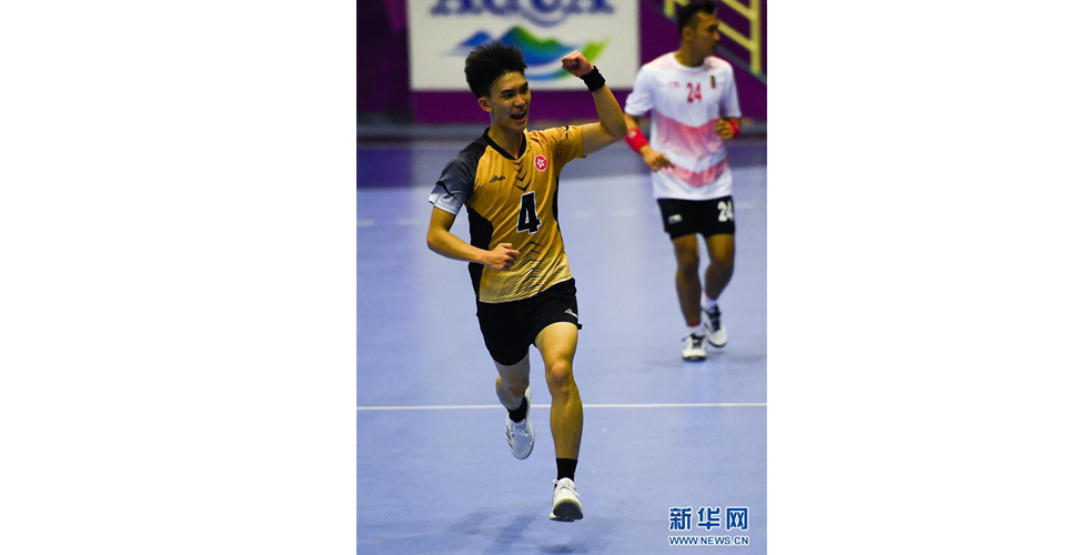 ↑8月13日,中国香港队球员黄泽桥(左)在比赛中庆祝得分。 当日,在雅加达举行的第18届亚运会男子手球小组赛中,中国香港队以40比17战胜印度尼西亚队。 新华社记者李响摄