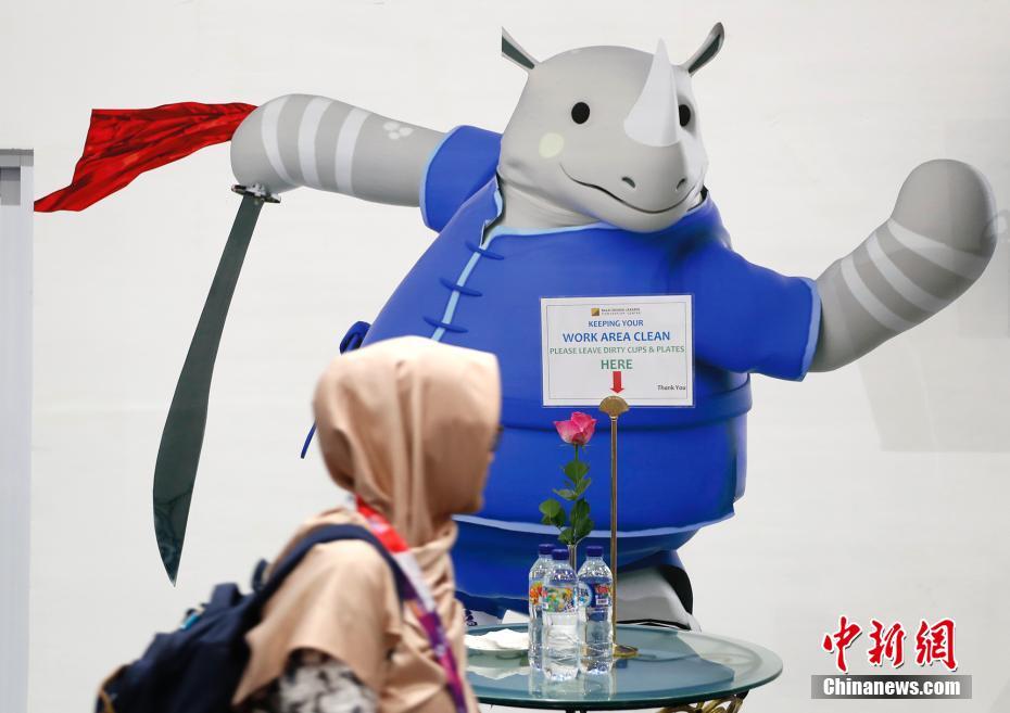 新闻中心内的墙上,贴着吉祥物的卡通形象。 中新社记者 刘关关 摄