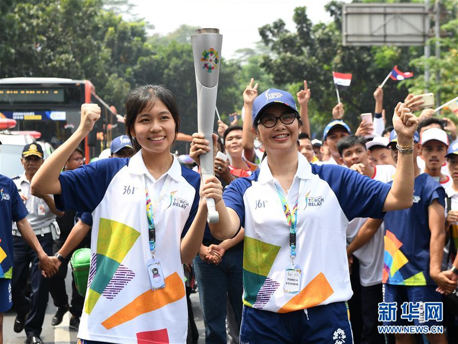 8月15日,来自中国的火炬手张鸿宜(前左)将火炬交给下一名火炬手。 当日,第18届亚运会火炬在印度尼西亚雅加达传递。第18届亚运会将于18日在雅加达开幕。 新华社记者李贺摄