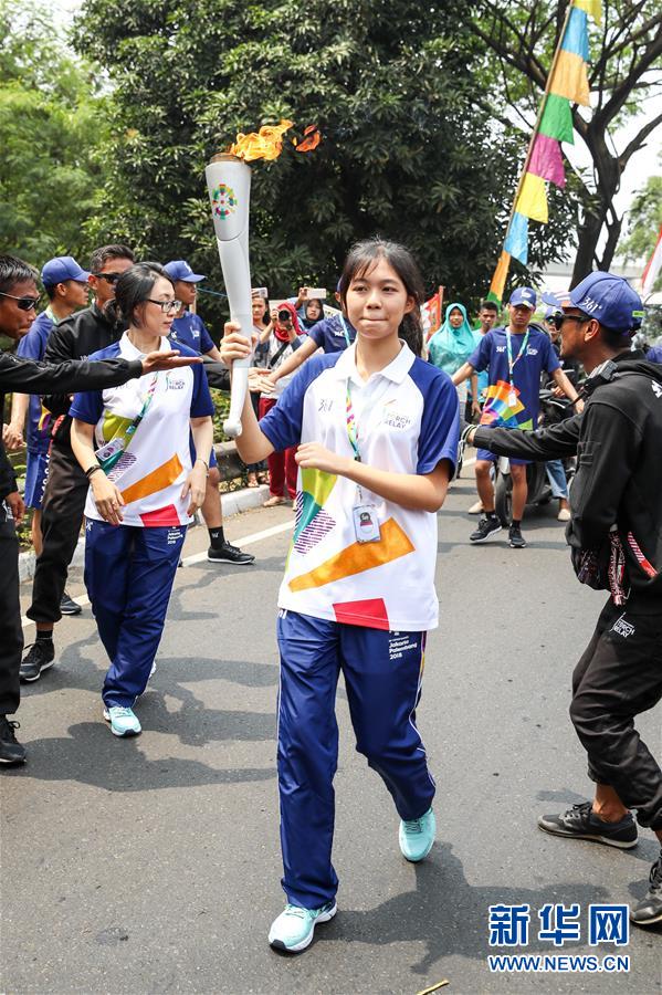 8月15日,来自中国的火炬手张鸿宜在传递火炬。 当日,第18届亚运会火炬在印度尼西亚雅加达传递。第18届亚运会将于18日在雅加达开幕。 新华社记者朱炜摄