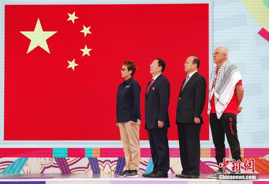 当地时间8月16日,第18届亚运会中国体育代表团升旗仪式于在亚运村升旗广场举行,肖若腾、华天等运动员参加了升旗仪式。 中新社记者 刘关关 摄