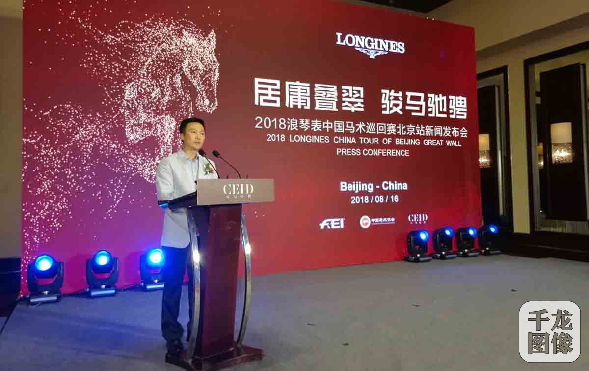 8月16日,2018浪琴表中国马术障碍巡回赛主办方在京宣布,北京站比赛将于9月14日至16日在居庸关长城脚下举行,为期三天。图为中国马术协会秘书长钟国伟致辞。千龙网发 主办方供图