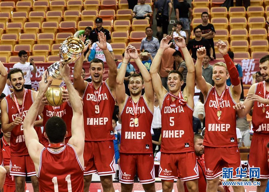 ↑8月17日,克罗地亚队队员庆祝夺冠。 当日,2018斯坦科维奇杯洲际篮球赛在广东深圳落幕,克罗地亚队夺得冠军,突尼斯与中国男篮蓝队分获亚军和季军。 新华社记者毛思倩摄