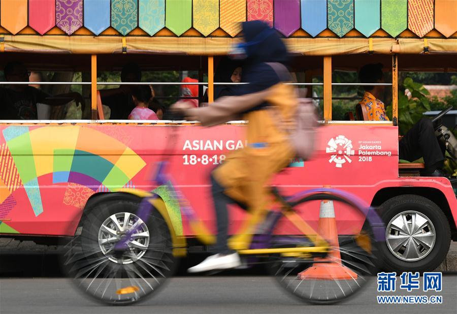 8月14日,雅加达独立广场上行驶的观光车披上了亚运元素“外衣”。 8月18日,第18届亚运会将在雅加达揭幕。 新华社记者李贺摄