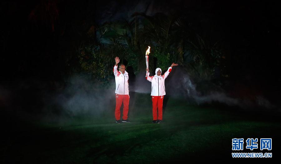 8月18日,火炬手在交接火炬。 当日,第18届亚运会开幕式在印度尼西亚雅加达举行。新华社记者王丽莉摄