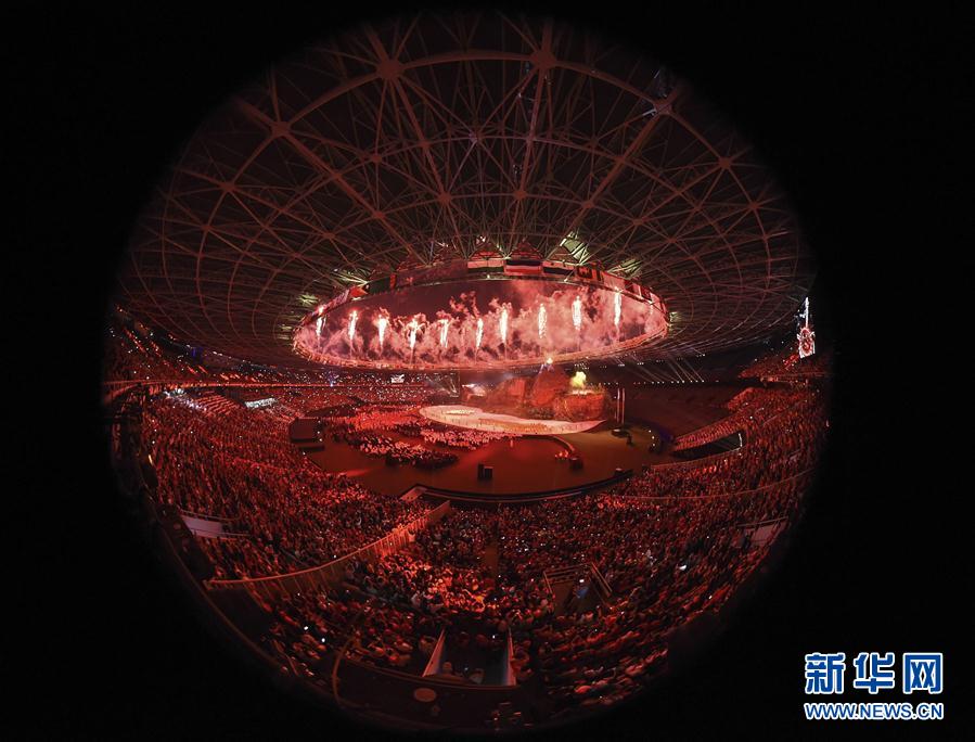 8月18日,第18届亚运会开幕式在印度尼西亚雅加达举行。这是开幕式上燃放烟花(8月18日摄)。新华社记者潘昱龙摄
