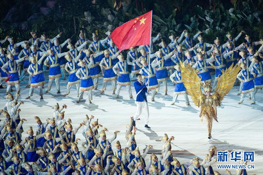 ↑8月18日,中国代表团在开幕式上入场。 当日,第18届亚运会开幕式在印度尼西亚雅加达举行。新华社记者张金加摄