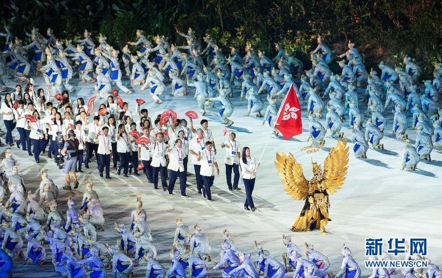↑8月18日,中国香港代表团在开幕式上入场。 当日,第18届亚运会开幕式在印度尼西亚雅加达举行。 新华社记者张金加摄