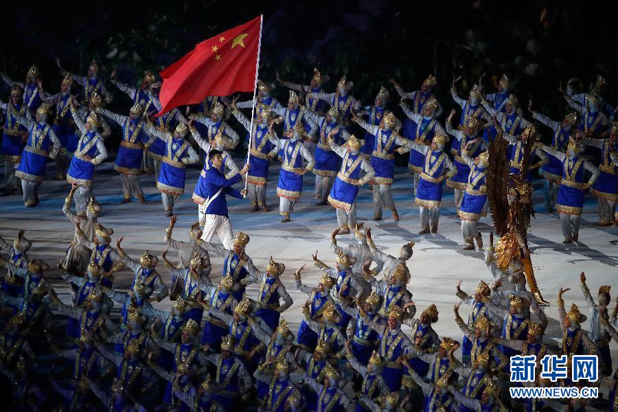 ↑8月18日,中国代表团旗手赵帅在开幕式上入场。 当日,第18届亚运会开幕式在印度尼西亚雅加达举行。新华社记者王丽莉摄