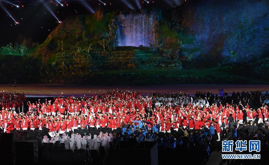 ↑8月18日,印度尼西亚代表团在开幕式上入场。 当日,第18届亚运会开幕式在印度尼西亚雅加达举行。新华社记者王毓国摄