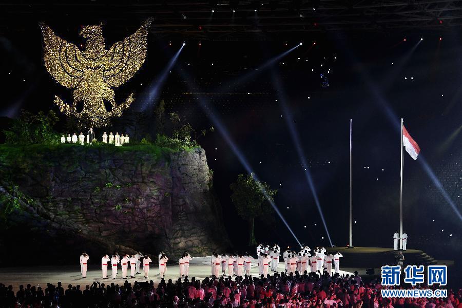 ↑8月18日,第18届亚运会开幕式在印度尼西亚雅加达举行。 这是开幕式上的升旗仪式。新华社记者王毓国摄
