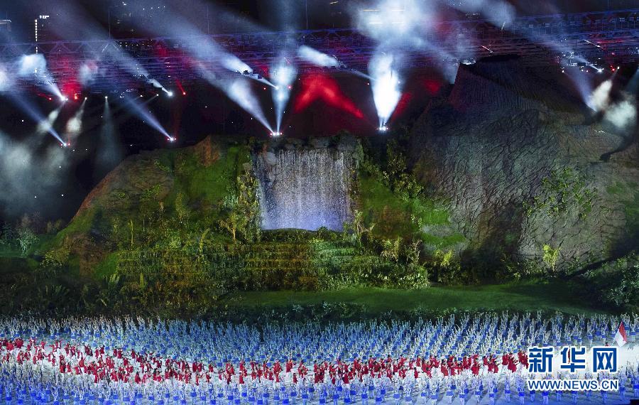 ↑8月18日,印度尼西亚代表团在开幕式上入场。 当日,第18届亚运会开幕式在印度尼西亚雅加达举行。 新华社记者张金加摄