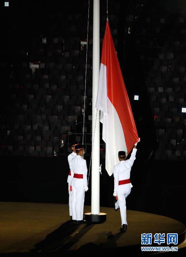 ↑8月18日,第18届亚运会开幕式在印度尼西亚雅加达举行。 这是开幕式上的升旗仪式。新华社记者王丽莉摄