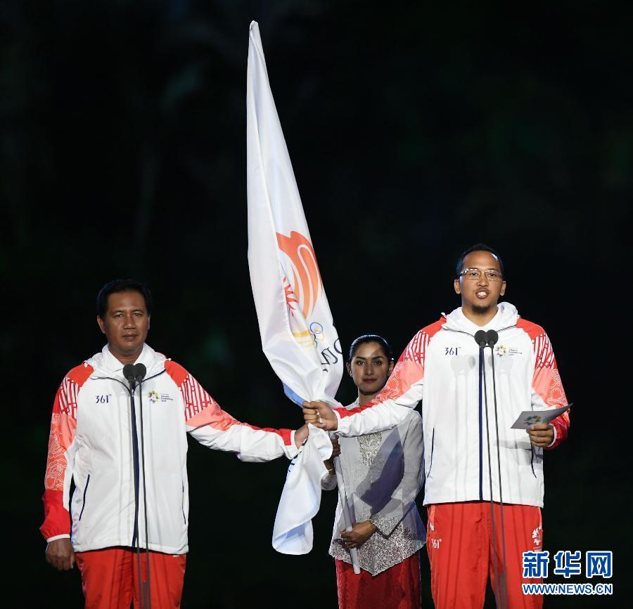 ↑8月18日,第18届亚运会开幕式在印度尼西亚雅加达举行。 这是开幕式上的宣誓仪式。 新华社记者岳月伟摄